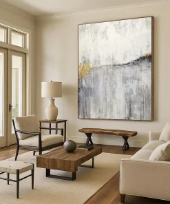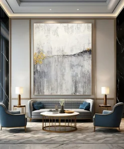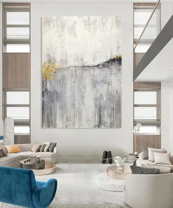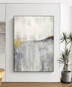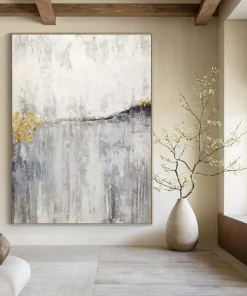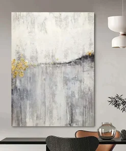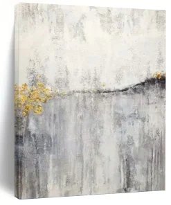 Inspired by the beauty of a misty landscape with golden flowers, the artist used soft, textured brushstrokes to create a dreamy and ethereal scene. This work suits a bedroom, creating a peaceful and restful atmosphere, or a relaxation room, where its calming colors and textures can soothe the mind. Let this abstract grey landscape with gold blossoms transport you to a peaceful and magical place.