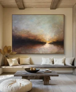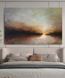 Inspired by sunset views, the artist used warm tones to create a landscape with reflective waters. They wanted to convey the beauty of the setting sun. Ideal for a dining room or a patio, adding warmth. As they painted, they focused on the reflection details. It’s a tribute to sunset beauty, inviting viewers to enjoy the glow.