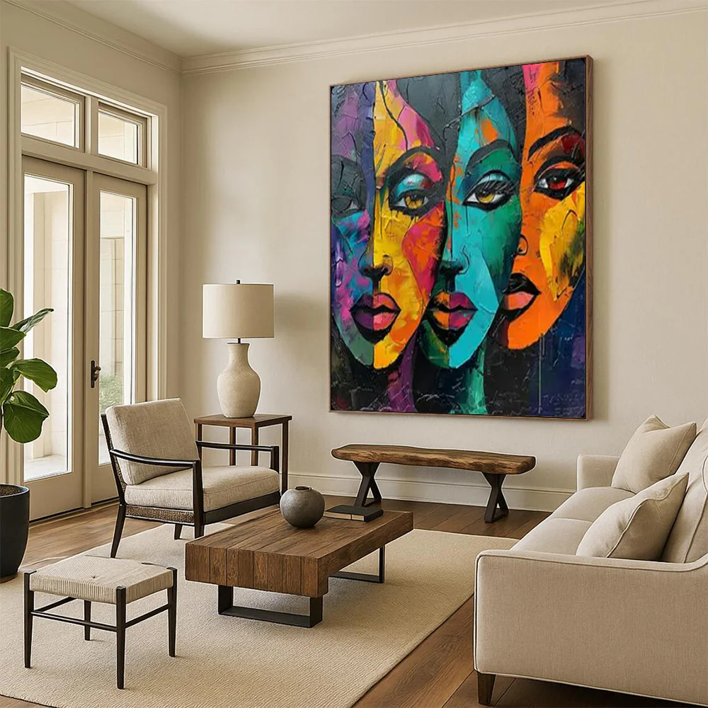 Embracing diversity, the artist used a rainbow of colors and bold shapes. Each hue represents a unique story. This painting is a lively celebration of human differences, perfect for adding energy to a living room or art studio. Packaging: Each artwork is professionally rolled and secured in a durable hard-shell tube for safe transit with a 2–3 inch white border around the painting for easy stretching or framing at your local shop. Delivery Timeline: Expect your painting within 7–12 business days including 3–5 days for handcrafting by our artists and 5–7 days for worldwide delivery via UPS or FedEx with a tracking number provided immediately upon shipping.
