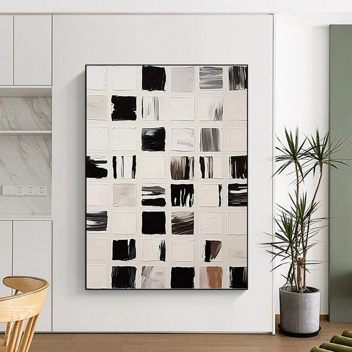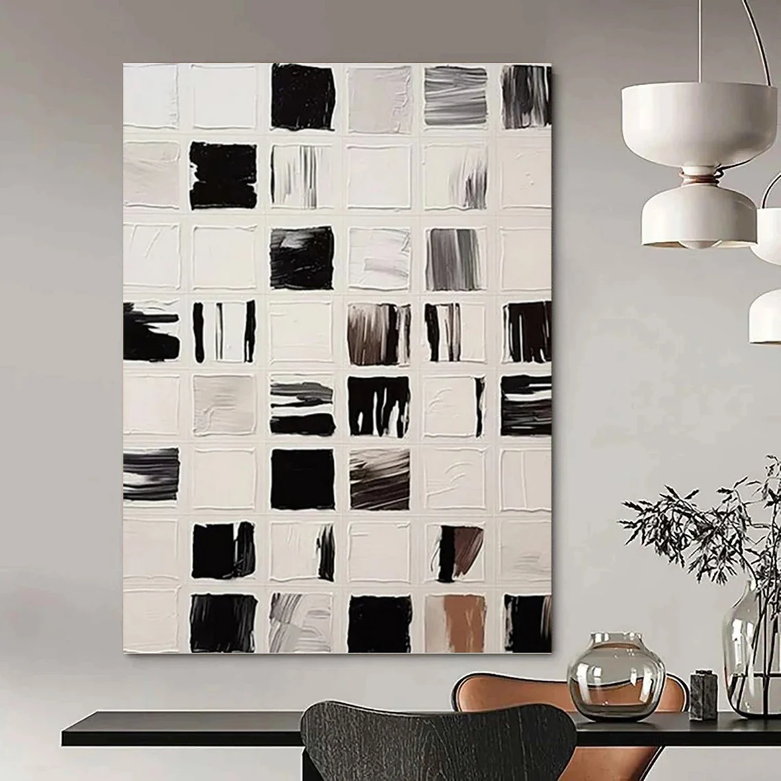 The artist was inspired by the simplicity and complexity of square forms. Using black and white, they created a grid of squares with varied textures and brushstrokes, each square telling its own visual story. This work fits a modern office, adding a touch of artistic sophistication, or a living room, complementing a minimalist and modern decor. Let the black and white square abstraction bring a sense of modern artistry to your space.