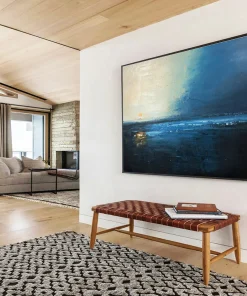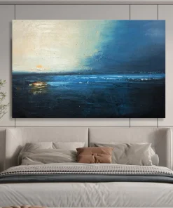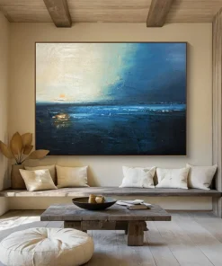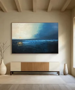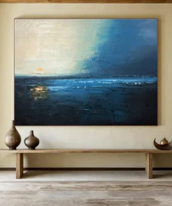 One evening, the artist found themselves alone on a beach, watching the sun dip below a stormy sky, the sea a mix of deep blues and faint oranges. Using moody acrylics, they aimed to capture that bittersweet, tranquil feeling—the day ending, the night beginning. It’s ideal for a bedroom facing the ocean, enhancing the coastal vibe, or a sophisticated library, adding a touch of reflective beauty. The process involved layering dark blues and hints of warm color, mimicking the sky’s transition. Each stroke holds the quiet magic of that twilight moment, inviting viewers to sink into the painting’s calm, to reflect on the day’s end and the peace it can bring.