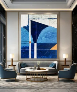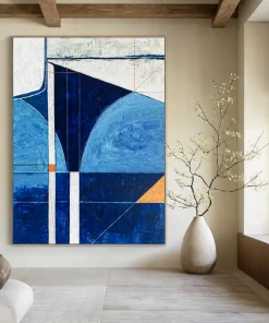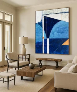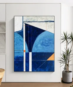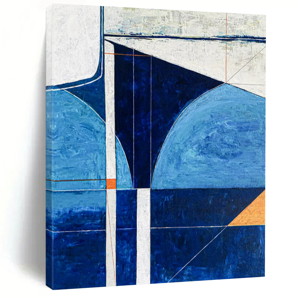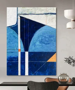 Coastal cool meets modern geometry. The artist, inspired by the sea, used various blues and a hint of orange. They carefully plotted geometric shapes, layering acrylics to create depth. It was a journey of capturing the ocean’s calm and the modern world’s structure. Hang it in a coastal home office for focused tranquility or a modern lounge for a stylish, serene vibe. This art is a bridge between nature and design. Packaging: Each artwork is professionally rolled and secured in a durable hard-shell tube for safe transit with a 2–3 inch white border around the painting for easy stretching or framing at your local shop. Delivery Timeline: Expect your painting within 7–12 business days including 3–5 days for handcrafting by our artists and 5–7 days for worldwide delivery via UPS or FedEx with a tracking number provided immediately upon shipping.