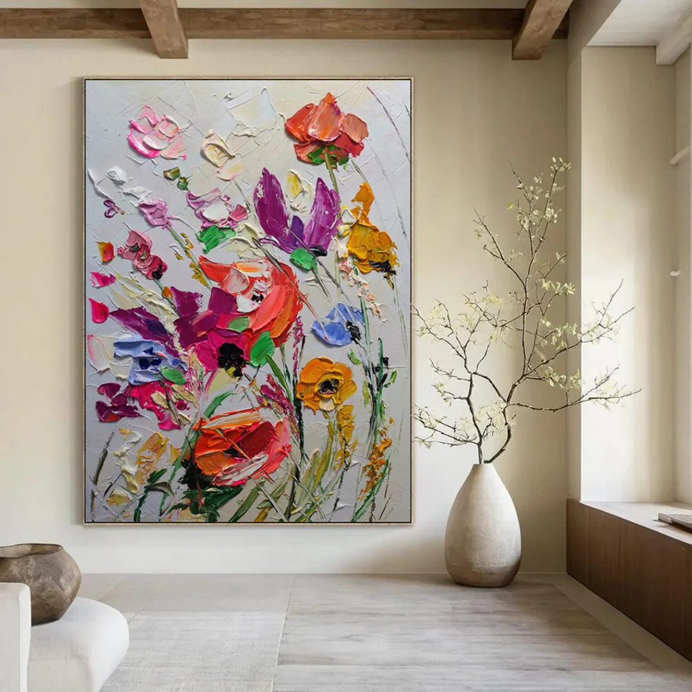 Using thick, sculptural paint, the artist brings a bouquet to life with vibrant colors and exaggerated textures. The expressive, almost chaotic style channels post – impressionist energy, making flowers feel alive and dynamic. Perfect for a dining room or entryway, adding a burst of natural vibrancy.