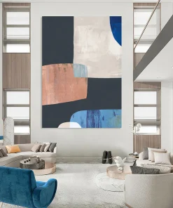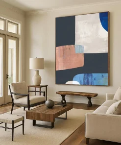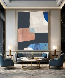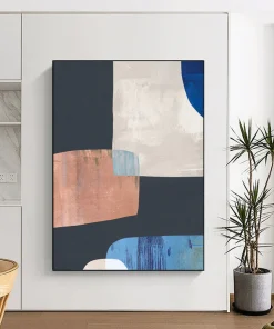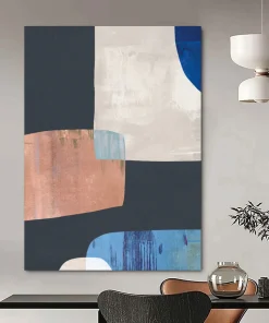 Fascinated by the clean lines of modern furniture design, the artist played with geometric shapes, using black as a grounding base, then adding white, blue, and copper to create a balanced, yet intriguing composition. The subtle color interactions and sharp angles echo the minimalist – geometric style of Sol LeWitt. Ideal for a contemporary office lobby or a sleek kitchen backsplash area. Hang it, and let the geometric color harmony bring a sense of polished order to your space.
